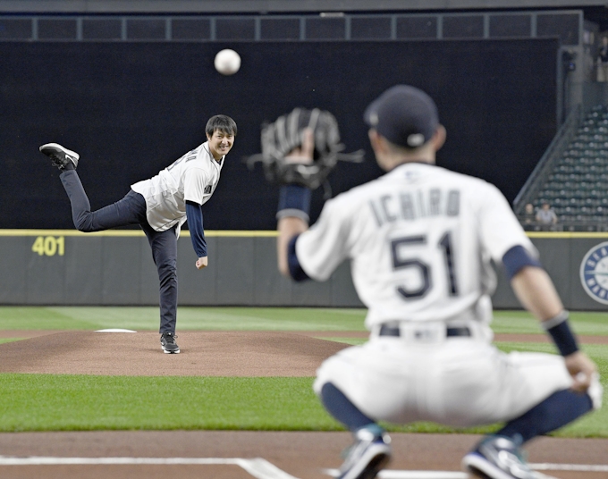 岩隈が始球式 イチロー捕手役 今季限りでマ軍退団 日本経済新聞